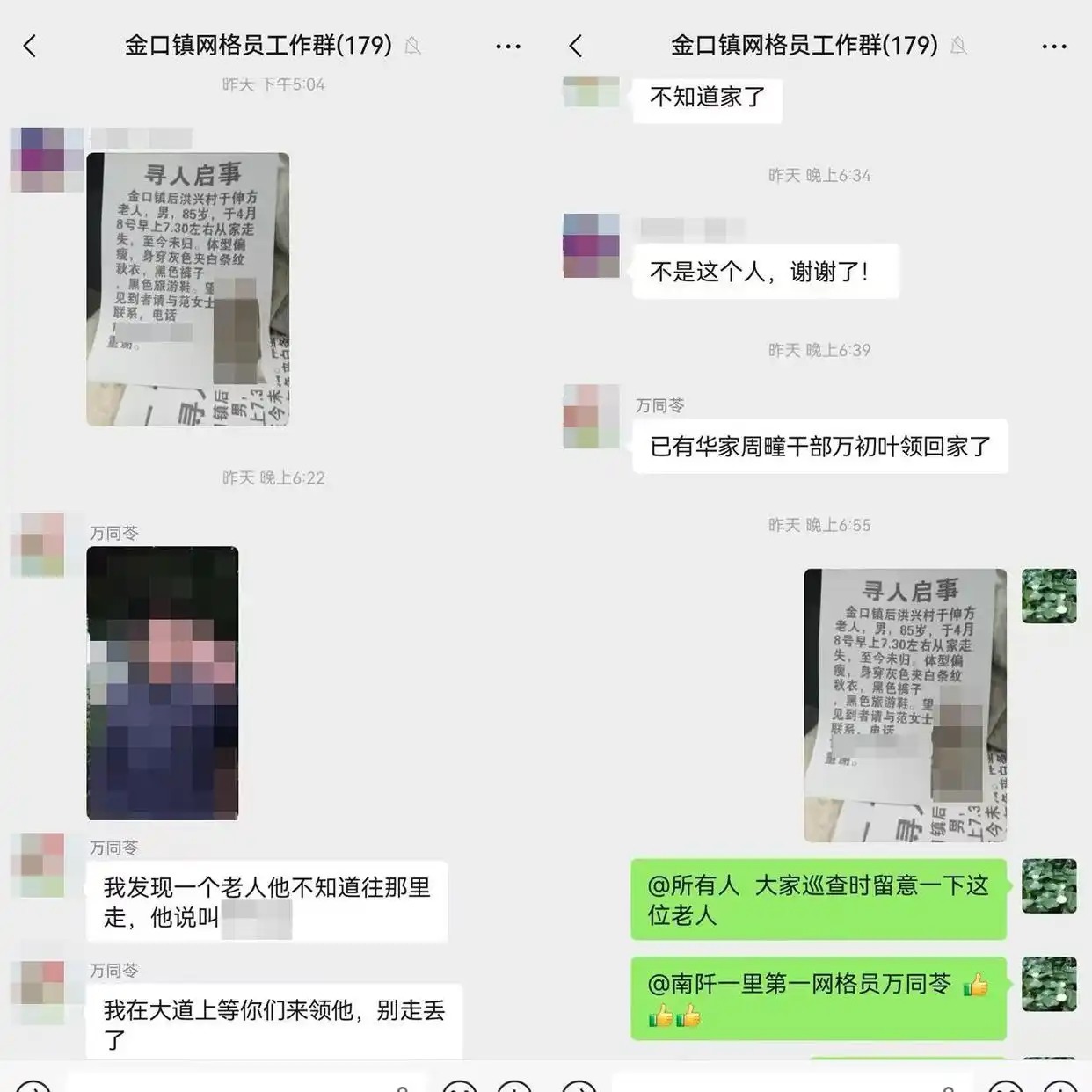 网格员工作群里发布了走失老人的信息。(来源:金口镇)信网4月9日讯 “小万,我出去遛弯的时候碰见一个老人自己往卧牛山方向走,说是要回华家周疃村的家。我跟他说走反了,可他一转头看起来还是迷迷糊糊的,我有点不放心。”4月8日傍晚,青岛市即墨区金口镇南阡一里村的网格员万同苓接到了村民万泽强的电话,这通电话让万同苓想起镇网格群里转发过好几次走失老人的信息,就赶紧骑上电动车,朝着村民说的方向去寻人。